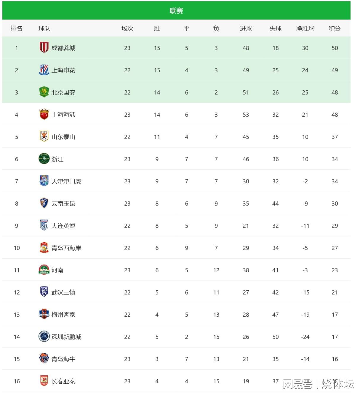 中超积分榜:成都蓉城大胜暂时领跑,云南玉昆绝平亚泰稳住前十